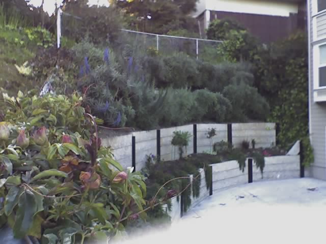 This garden is in a backyard on the side of a hill.